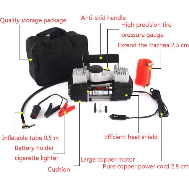 Kompresor angin ini dapat menghasilkan angin hingga 100 PSI. Dapat digunakan untuk memompa ban sepeda, mobil, motor, dll. Hadir dengan bentuk yang ringan dan portable sehingga tetap mudah untuk Anda bawa kemana saja.FEATURESPortable DesignMemiliki bentuk yang portable sehingga dapat dengan mudah dimasukkan kedalam mobil dan selalu dibawa untuk berjaga-jaga jika ingin digunakan.Real 100 PSIMeskipun memiliki bentuk yang portable, namun dapat menghasilkan tekanan angin hingga 100 PSI. Cigarette PlugDapat dinyalakan dengan mencolok kompresor angin ke cigarette lighter plug di mobil.PACKAGE CONTENTSBarang-Barang yang Anda dapatkan dalam kotak produk:1 x Pompa Ban Mobil Heavy Duty Air Compressor Double Cylinder 12V 100 PSI1 x Battery Holder Cigarette Lighter1 x Extend Tube1