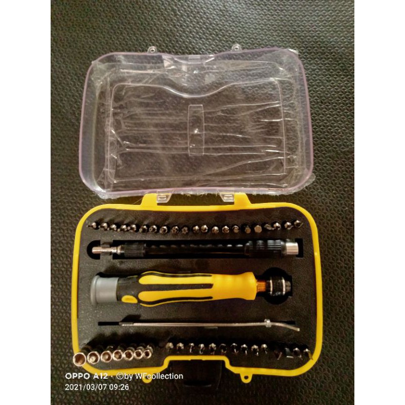 Informasi Produk A Must Have Repair Tool KitsObeng Set ini hadir dengan 45 jenis kepala obeng dengan kualitas besi yang kuat dan tahan lama. Obeng set ini dilengkapi dengan kotak untuk menyimpan kepala obeng dan aksesoris lainnya sehingga memudahkan Anda membawanya ke mana saja.FeaturesProfessional Portable Hardware ToolsPeralatan obeng ini cocok untuk Anda yang memerlukan kepala obeng dengan berbagai jenis namun tetap mudah untuk dibawa kemana saja.High Hardness And Good ToughnessSemua perlengkapan set ini terbuat dari material baja CR-V yang merupakan besi dengan kualitas terbaik. Memastikan peralatan kerja Anda tahan lama dan awet dalam penggunaan sehari-hari.Smartphone/Electronics Repair ToolUntuk Anda yang sering memperbaiki smartphone dan tablet serta segala macam peralatan elektronik, maka obeng set ini wajib untuk Anda miliki. Tools lengkap ini telah tersedia berbagai peralatan yang memudahkan proses reparasi seperti opening tools untuk berbagai macam baut.Barang-barang yang Anda dapatkan di dalam box :1 Pcs 10 cm Extended bar 1 Pcs 12 cm handle 1 Pcs 11.7 cm clamps 1 Set CRV socket: M2.5, M3.0, M3.5, M4.0, M4.5, M5.0, M5.5 1 Set Torx screwdriver: T3, T4, T5, T6, T7, T8, T9, T10, T15, T20 1 Set screwdriver Hex: H0.9, H1.3, H1.5, H2.0, H2.5 , H3.0, H3.5, H4.01 Set Screwdriver Cruz 1.0, 1.5, 2.0, 2.5, 3.51 Set Slotted screwdriver: 1.0, 1.5, 2.0, 2.5, 3.0, 3.5, 4.01 Pcs Screwdriver: 2.0 1 Pcs Star screwdriver: 0.8 1 Set Screwdriver: 2.0, 2.51 Set screwdriver Circle: 1.5Spesifikasi Obeng Set Reparasi 45 in 1 - 6093 (400)MaterialBaja CRVGaransi1 Bulan