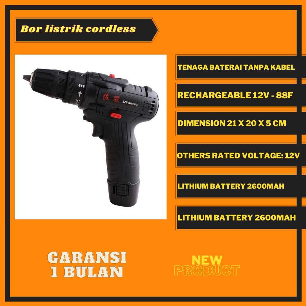 === Selamat Datang di starkidskids ===*** Sebelum order untuk memastikan stok barang bisa chat (fastrespon)*** Jangan lupa follow dan selalu cek uploadan terbaru kita *** Garansi Produk, Cacat Retur Dihari Yang Sama (Buktikan dengan video saat unboxing)*** Bahan Dijamin Berkualitas*** Dapatkan Voucher Menarik Ditoko Kami*** Diskon Semua Produk*** Gratis Ongkir*** Open Reseller dan Dropshipper*** Produk dari tangan pertamaSebelum Checkout, harap membaca deskripsi terlebih dahulu yaInformasi pelayanan Toko :- Real Picture - Pengiriman Senin s.d Sabtu- Order sebelum jam 16.00 akan dikirim hari dihari yang sama- Hari Minggu dan Tanggal Merah Libur Pengiriman7ROTBZBKBor listrik cordless ini menggunakan tenaga baterai sehingga tidak ada kabel yang menggangu Anda saat bekerja. Bor memiliki kecepatan dan stabilitas serta power yang tinggi dapat membantu Anda untuk mengerjakan pekerjaan rumah seperti bor papan, bor kayu, dan bahkan dinding.FITURTanpa Kabel / Power BaterauTidak menggunakan kabel sehingga tidak mengganggu pergerakan Anda. Menggunakan baterai dengan kapasitas besar untuk mentenagai bor listrik ini. Keyless Chuck drill yang strong untuk segala pekerjaan rumahPowerful MotorBor ini memiliki power yang tidak kalah dari bor biasanya, beroperasi dengan 12V DC dan dapat berputar hingga kecepatan high speed RPM sehingga Anda dapat mengerjakan pekerjaan berat hingga mengebor dinding. RPM dapat di atur dengan adjustmen kontrolKecepatan Putar Bisa DiaturTersedia 2 mode kecepatan yaitu mode high dan mode low. Pilih kecepatan yang sesuai dengan kebutuhan Anda.Mudah DigunakanBor ini di desain untuk mudah digenggam, mudah digunakan dan mudah dibawa kemanapun Anda inginkan, sangat menolong Anda ketika hendak membetulkan sesuatu.PACKAGE CONTENTSBarang-barang yang Anda dapat dalam kotak produk:1 x Zuoguan Bor Listrik Cordless Lithium Battery Rechargeable 12V - 88F2 x Drill Bit1 x Charger Adaptor2 x Battery1 x ManualTechnical Specifications of Zuoguan Bor Listrik Cordless Lithium Battery Rechargeable 12V - 88FDimension 21 x 20 x 5 cmOthers Rated Voltage: 12VLithium Battery 2600mAhMotor: 0-600/1350r
