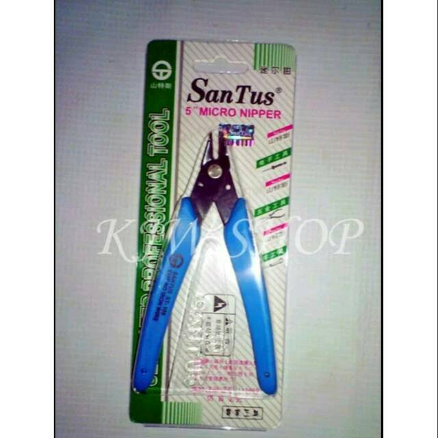 Tang potong dengan merk SANTUS Biru ST-109 (Japan) sangat tajam.Difungsikan sebagai pemotong kaki komponen atau sejenisnya dengan maks diameter objek yang dapat dipotong adalah 1,2mm - 1