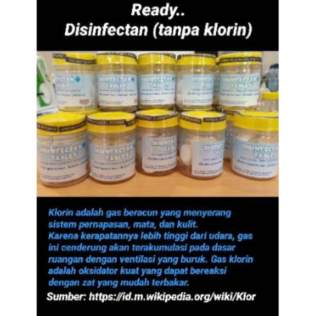 Disinfectan Tablet (1bottol isi 10tablet).Effective againts virus, bacteria, and fungi.1tablet bisa utk dilarutkan 10-20Liter air.Kandungan yang aman tanpa mengandung klorin (zat yg berbahaya).Definis KLORIN (Sumber:https://id.m.wikipedia.org/wiki/Klor)Klorin adalah gas beracun yang menyerang sistem pernapasan, mata, dan kulit.Karena kerapatannya lebih tinggi dari udara, gas ini cenderung akan terakumulasi pada dasar ruangan dengan ventilasi yang buruk. Gas klorin adalah oksidator kuat yang dapat bereaksi dengan zat yang mudah terbakar.#disinfektan #disinfektantablet #membunuhvirus #membunuhbakteri #membunuhj