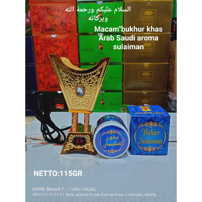 bukhur sulaiman. untuk pengharum ruangan, dengan wangi khas. banyak dicari untuk pengharum saat ada pengajian atau majelis ilmu. atau sebagai aroma terapi.Bentuk SerbukBerat 115GR gramTekstur berminyakWarna HitamWangi tahan lamaAROMA READY STOCK BAKHUR SULAIMANBAKHUR MAGHROBIBAKHUR MALIKUL OUDHDapat juga digunakan di:1. Ruangan AC2. Cafe3. Restoran4. Toko5. Kantor6. Acara pernikahan7. Ritual acara keagamaan8. Pengharum Pada Acara - Acara Majlis* Untuk Acara Pernikahan Menerima Tamu*