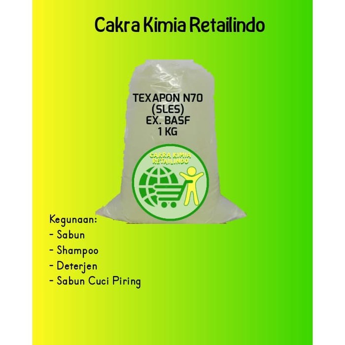 Deskripsi TEXAPON N70 EX. BASF (GERMANY) / SODIUM LAURYL SULFATE / SLES 3 KGTEXAPON N70 EX. BASF (GERMANY) / SODIUM LAURYL SULFATE / SLES / SODIUM ODECYL SULFATE Berat Netto 3 KGKeterangan Texapon N70: - Anionic surfactant - Sebagai bahan baku pembuatan bahan kebersihan seperti sabun, shampoo, detergent, sabun cuci piring, dll untuk mengangkat lemak dan kotoran.NOTE:- BARANG READY STOCK- BARANG DIJAMIN ORISINIL- PENGIRIMAN HANYA SENIN - JUMAT- JNE, SICEPAT, TIKI, JNE MAKSIMAL ORDER/CHECK OUT PK 13.00 DIKIRIM HARI YANG SAMA- GRAB, GOSEND MAKSIMAL ORDER/CHECK OUT MASUK PK 13.00 DIKIRIM HARI YANG