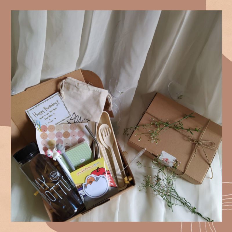 Gift Box isi banyak yg cocok untuk kado teman kerabat maupun pacar By siblingblinksize S : ♥Botol Transparan 550ml (1) ♥Sendok rami set non box (1) ♥Sedotan set (isi 3) (1) ♥Sticky memo (1)free stiker satu lembar + paper clipfree kartu ucapansize M : ♥Botol Transparan 550ml (1) ♥Notebook spiral mini (1) ♥Sendok rami set non box (1) ♥Sedotan set (isi 3) (1) ♥Pulpen karakter (1) ♥Sticky memo (1)free stiker satu lembar + paper clipfree kartu ucapansize L : ♥Botol 6oup 450ml (1) ♥Notebook spiral mini (1) ♥Sendok rami set box (1) ♥Sedotan set (isi 3) (1) ♥Pulpen karakter (2) ♥Sticky memo (1)free stiker satu lembar + paper clipfree kartu ucapansize XL : ♥Botol My Bottle 500ml (1) ♥Pounch My Bottle (1) ♥Notebook spiral mini (1) ♥Sendok rami set box (1) ♥Sedotan set (isi 3) (1) ♥Pulpen karakter (2) ♥Sticky memo (1)free stiker satu lembar + paper clipfree kartu ucapan